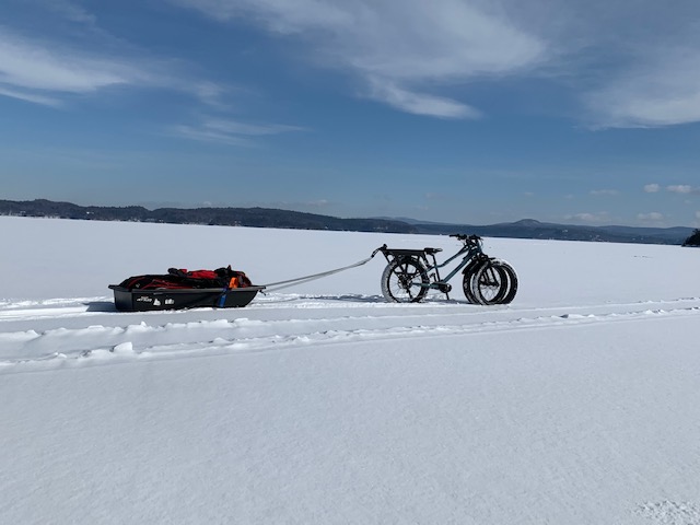 Rungu Dualie customer Chris Doyle, started ice fishing with a single-front-wheel E-Bike with studded tires.  He reported that “the single-front-wheel had no grip and he couldn’t control the bike. The front end washed out more times than he could count. On many occasions, the washouts sent Chris “a** over teakettle” into the snow if he was lucky and onto the ice if he wasn’t.”